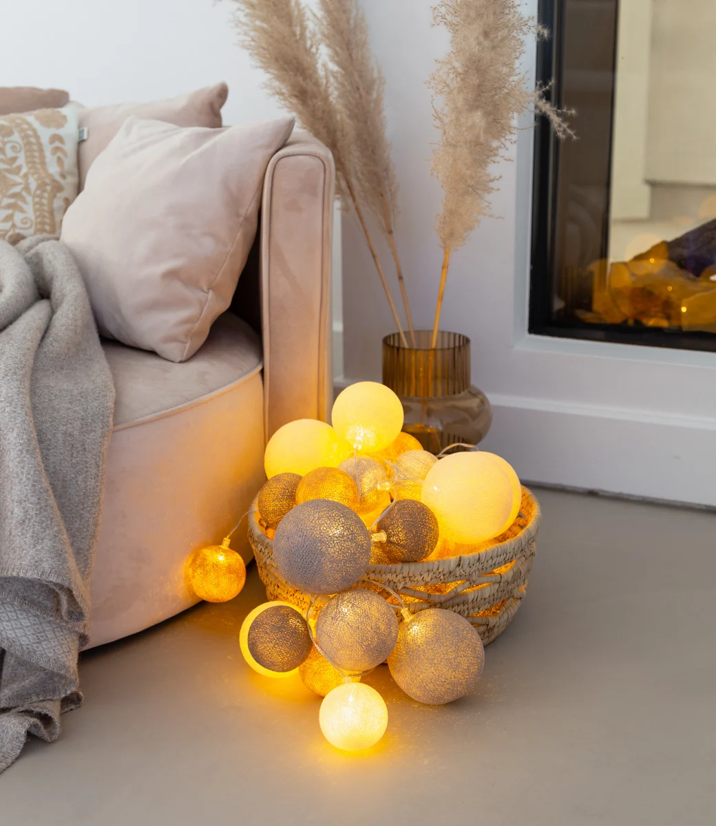 Deze balletjes met licht zijn verkrijgbaar in een slinger van 20 of 35 lampjes. De lichtslinger wordt inclusief adapter geleverd zodat je deze makkelijk in het stopcontact kunt steken, maar het is ook mogelijk om de adapter thuis te vervangen door een powerbank.